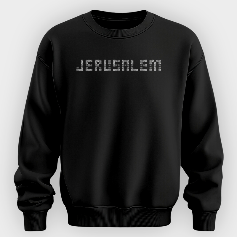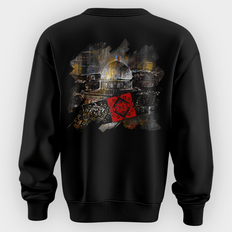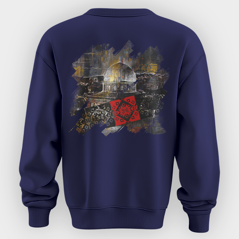 This Dome of the Rock Sweatshirt is a powerful statement piece featuring a front design with “JERUSALEM” in an elegant, embroidery-inspired font. The back showcases a stunning digital artwork of the iconic Dome of the Rock, surrounded by an abstract, textured background that conveys depth and history. A bold red Palestinian embroidery motif adds cultural significance to the design. Available in white, black and navy, this sweatshirt blends heritage with modern streetwear style, making it a meaningful and stylish choice for those who appreciate history and culture.