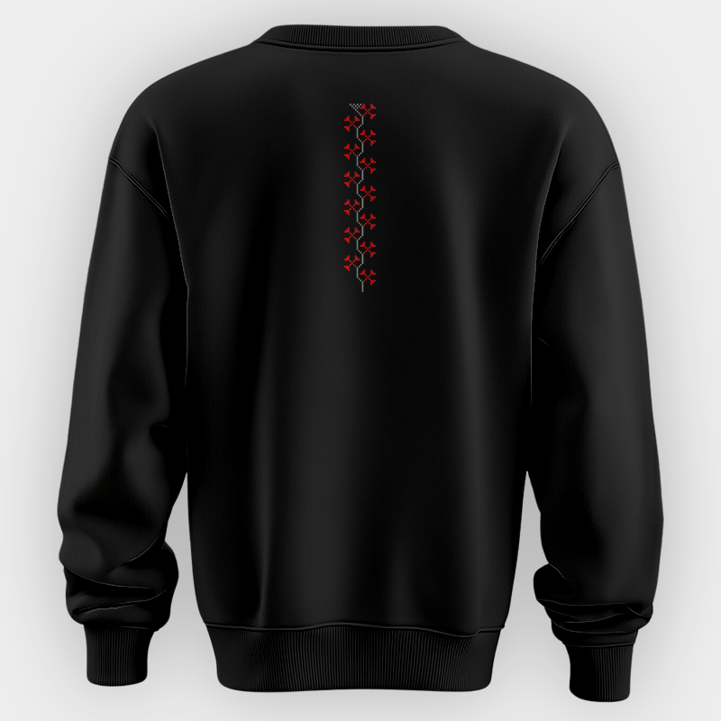 The Haifa Sweatshirt features a stunning Palestinian embroidery-inspired design, blending cultural heritage with modern streetwear. The front showcases a symmetrical tatreez-style pattern with the word “Haifa” integrated into the geometric design, surrounded by intricate red and black embroidery elements. The back includes a vertical floral embroidery detail on the hood, adding a subtle yet meaningful touch. Available in white, black and navy, this sweatshirt is a tribute to Palestinian artistry and identity.