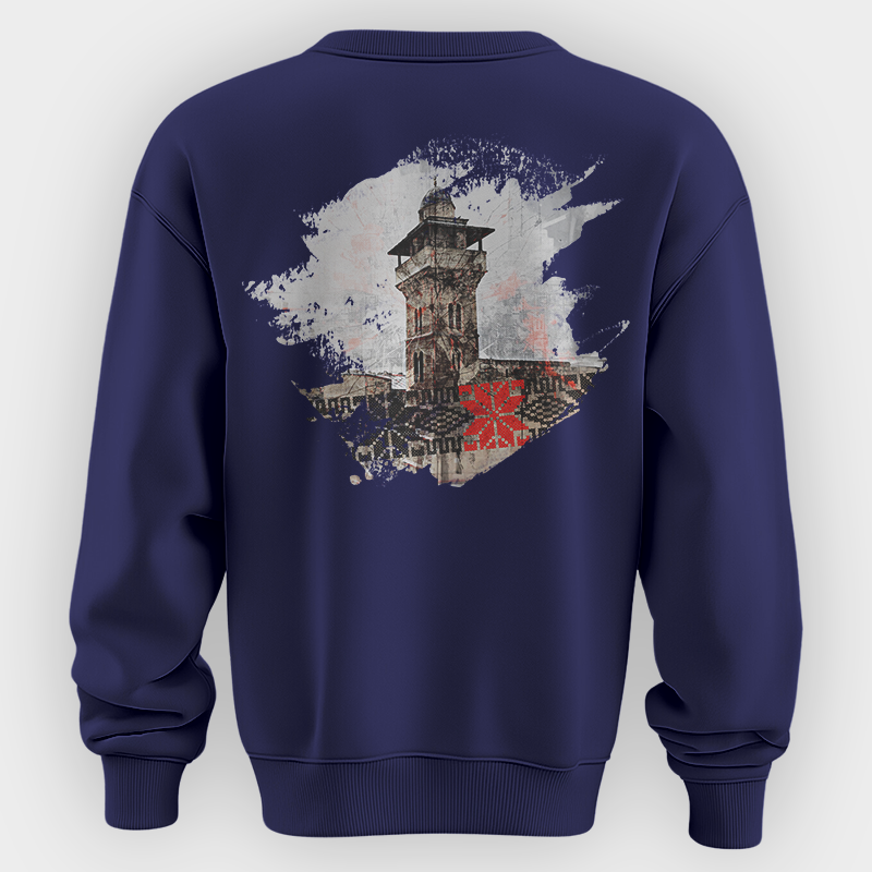 This premium sweatshirt, available in white, black and blue, features a tribute to Hebron with an artistic depiction of the Ibrahimi Mosque. The front showcases “HEBRON” in a traditional embroidery-inspired font, while the back displays a striking illustration of the mosque blended with Palestinian cultural patterns in a distressed, brushstroke style. A perfect fusion of heritage and modern streetwear.