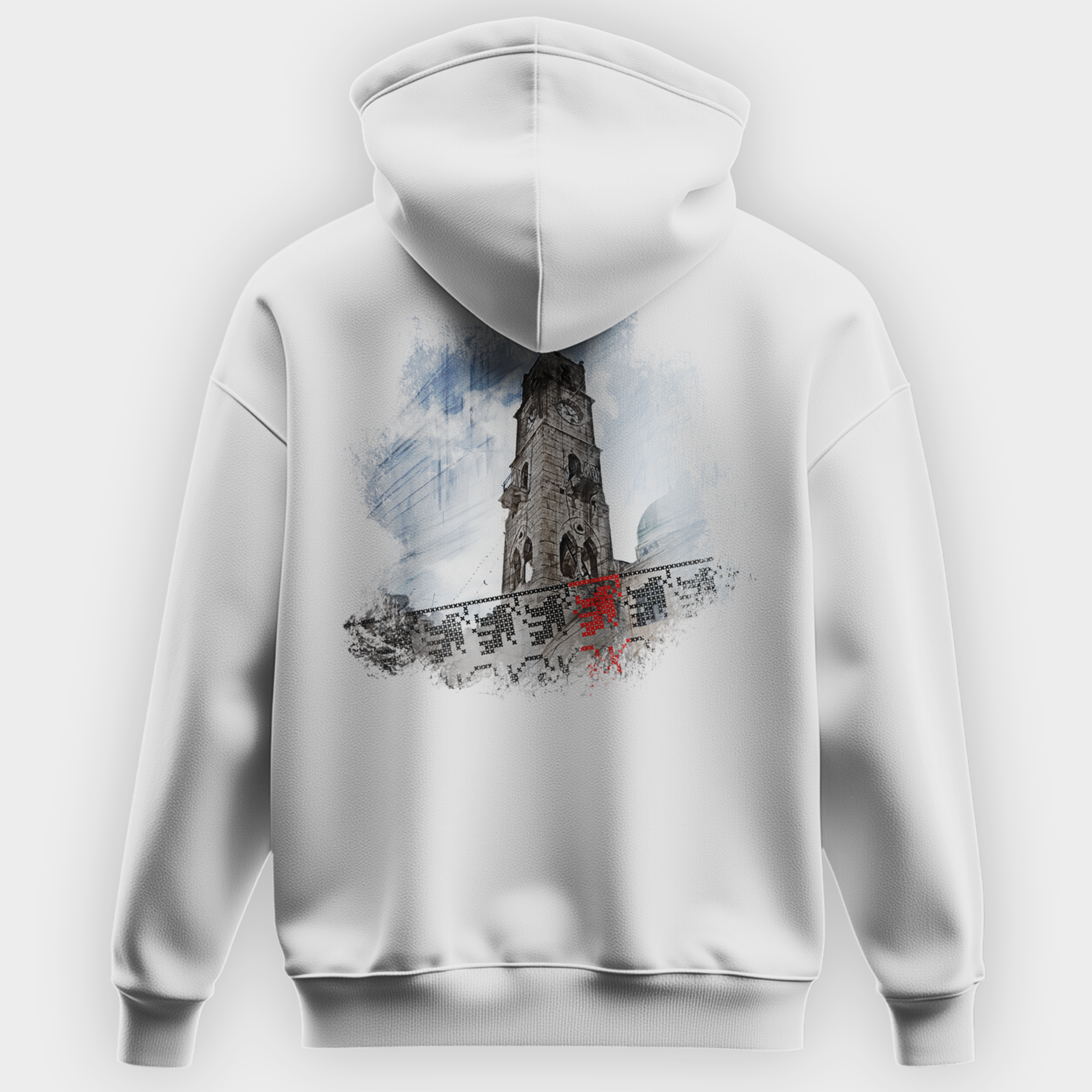 The back showcases a stunning artistic rendition of the Manara Clock Tower, an iconic symbol of resilience and history, set against a beautifully textured background. The intricate details and fusion of traditional motifs with modern streetwear make this hoodie a must-have for those who carry Nablus in their hearts.