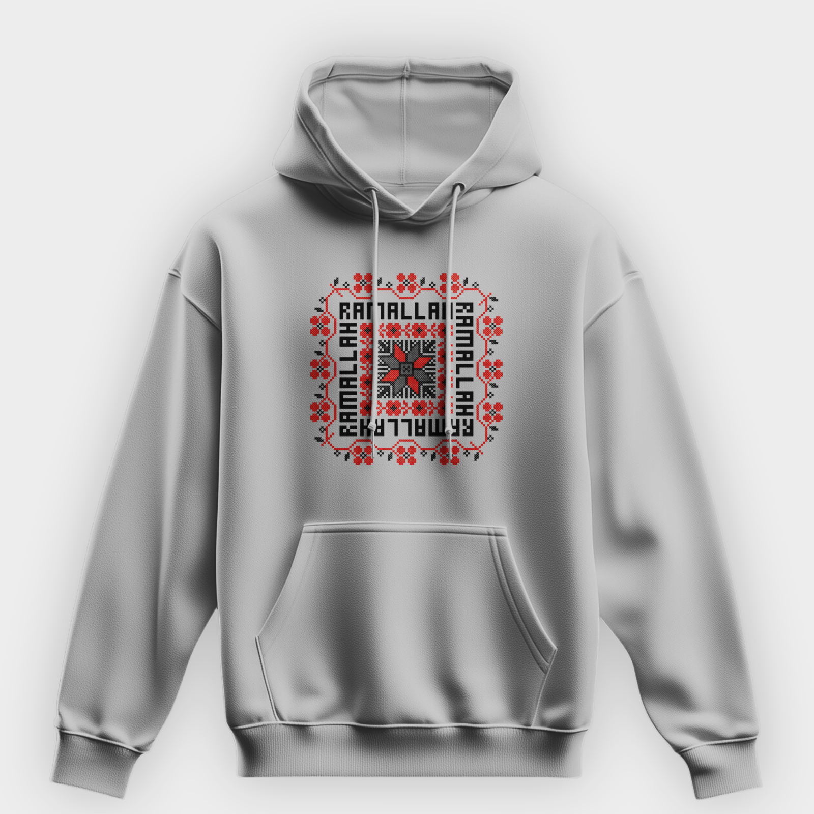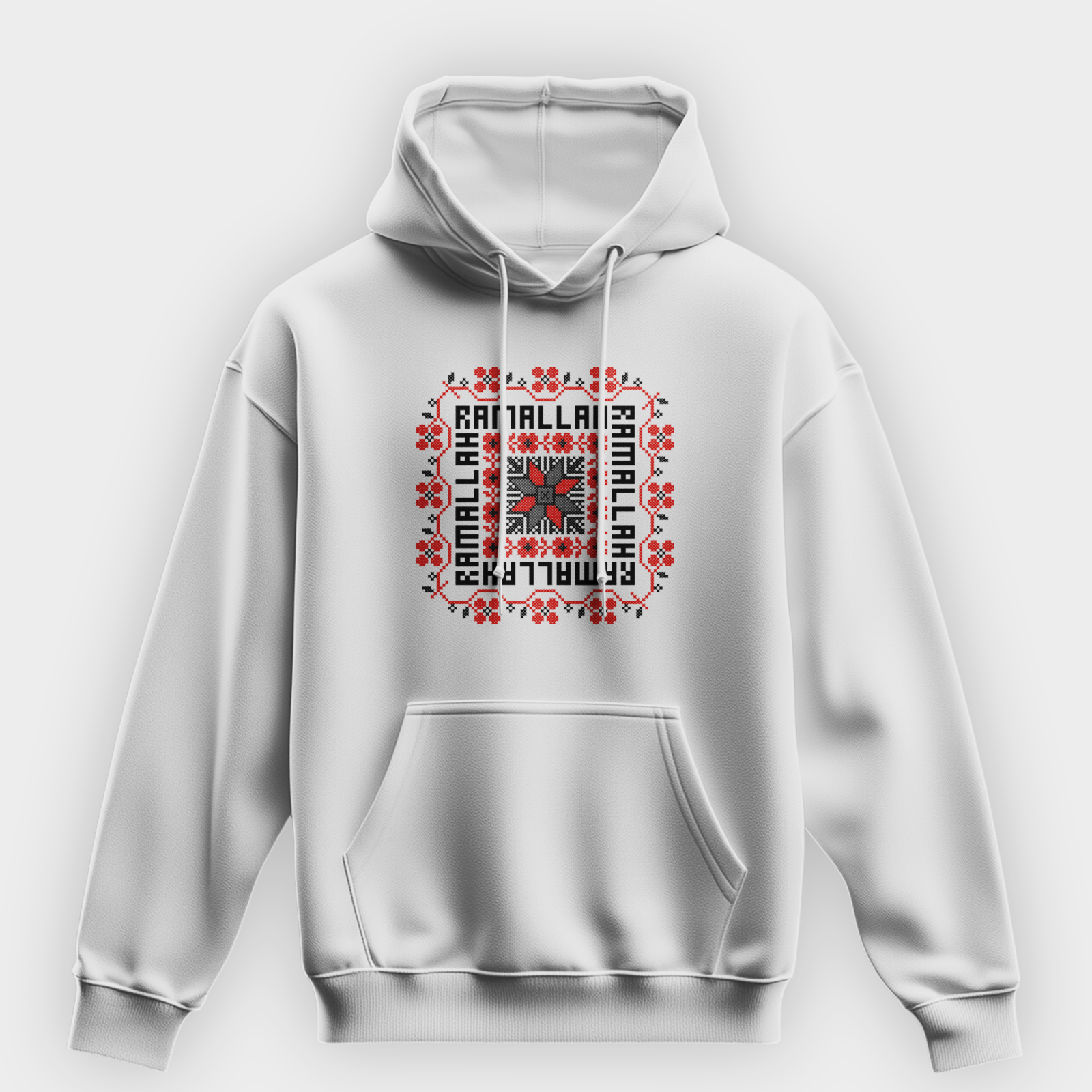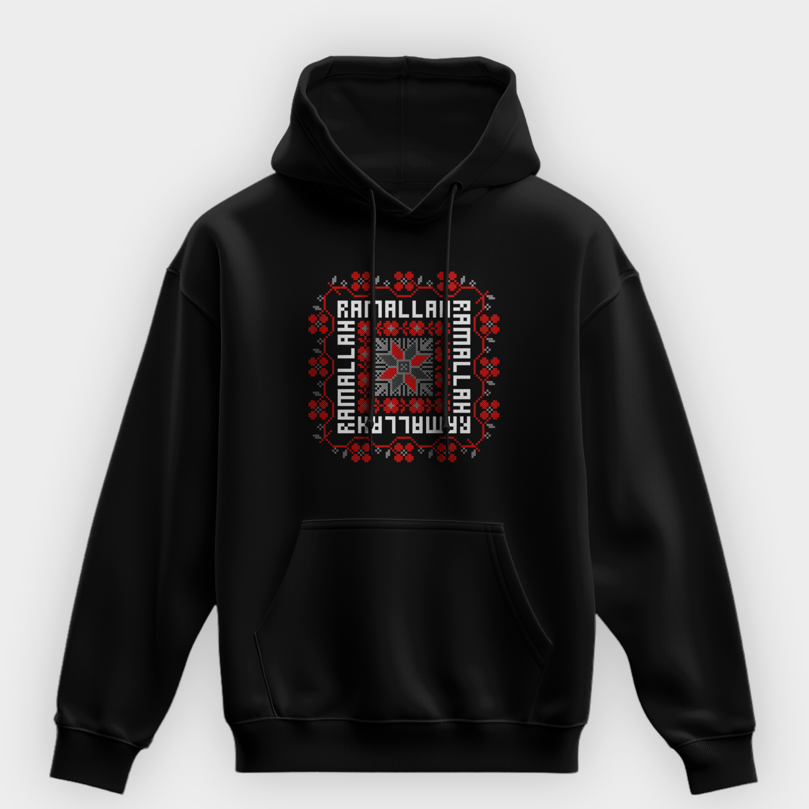 Introducing the Ramallah Heritage Hoodie, a fusion of tradition and modern streetwear. Featuring a vibrant Palestinian tatreez-inspired design, the front showcases “Ramallah” in a striking geometric pattern, surrounded by intricate red and black embroidery motifs. The back adds a subtle yet elegant embroidered strip, enhancing the cultural essence. Available in white, black, navy, maroon and grey, this hoodie is a perfect blend of heritage and style.