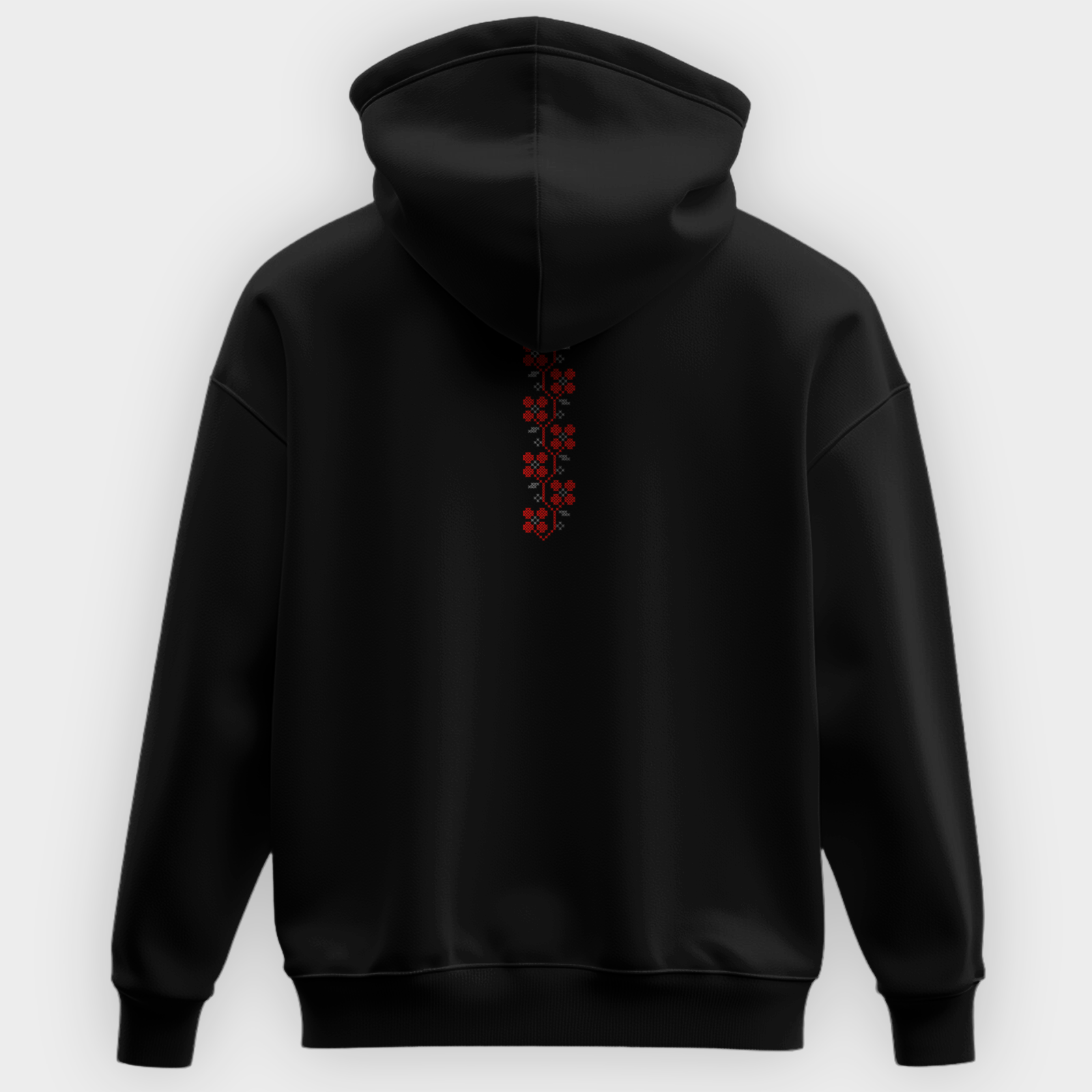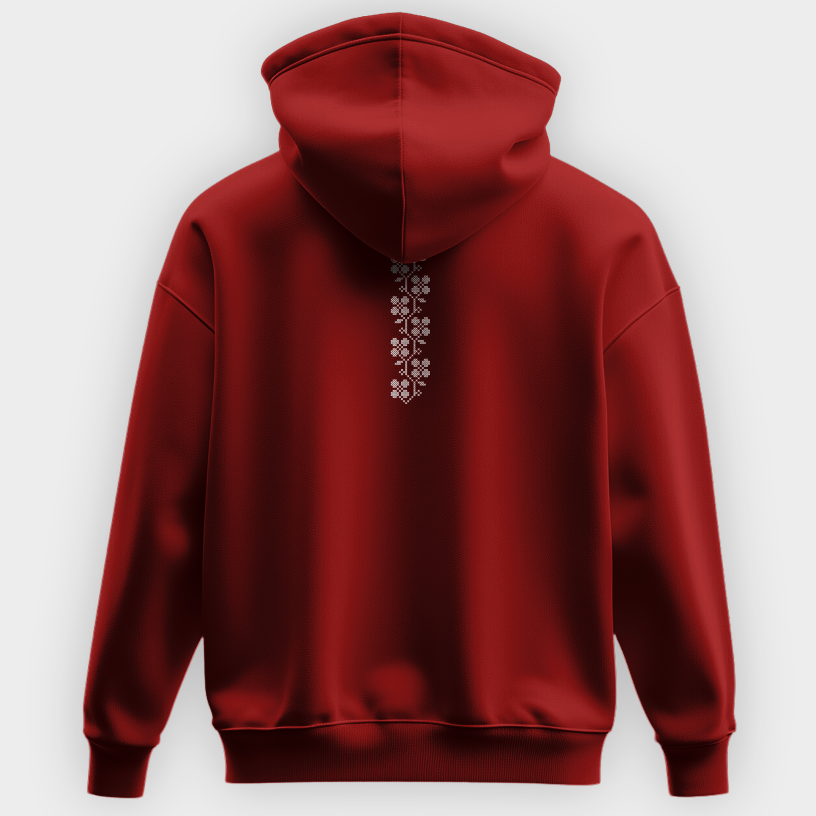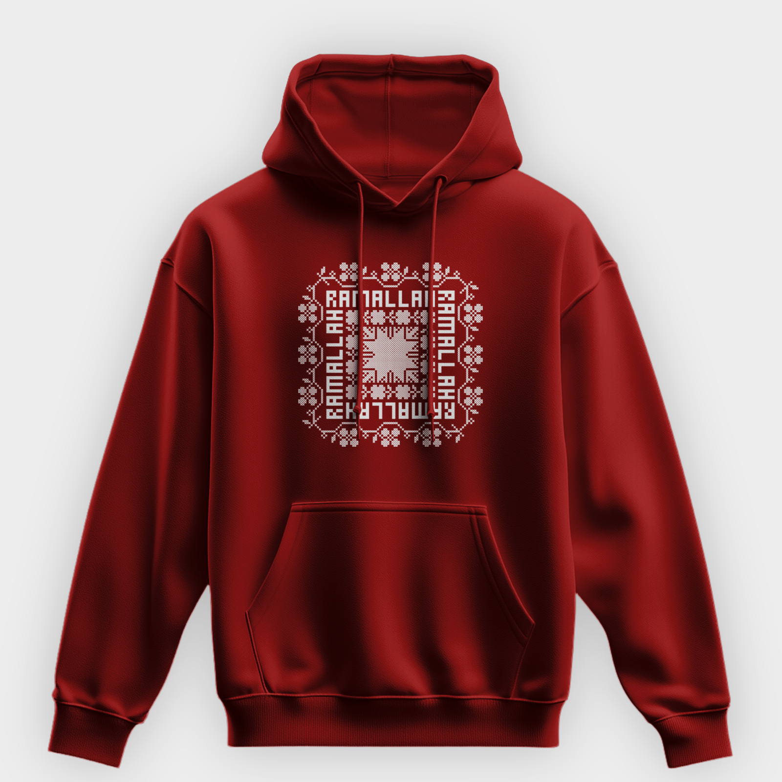 Introducing the Ramallah Heritage Hoodie, a fusion of tradition and modern streetwear. Featuring a vibrant Palestinian tatreez-inspired design, the front showcases “Ramallah” in a striking geometric pattern, surrounded by intricate red and black embroidery motifs. The back adds a subtle yet elegant embroidered strip, enhancing the cultural essence. Available in white, black, navy, maroon and grey, this hoodie is a perfect blend of heritage and style.