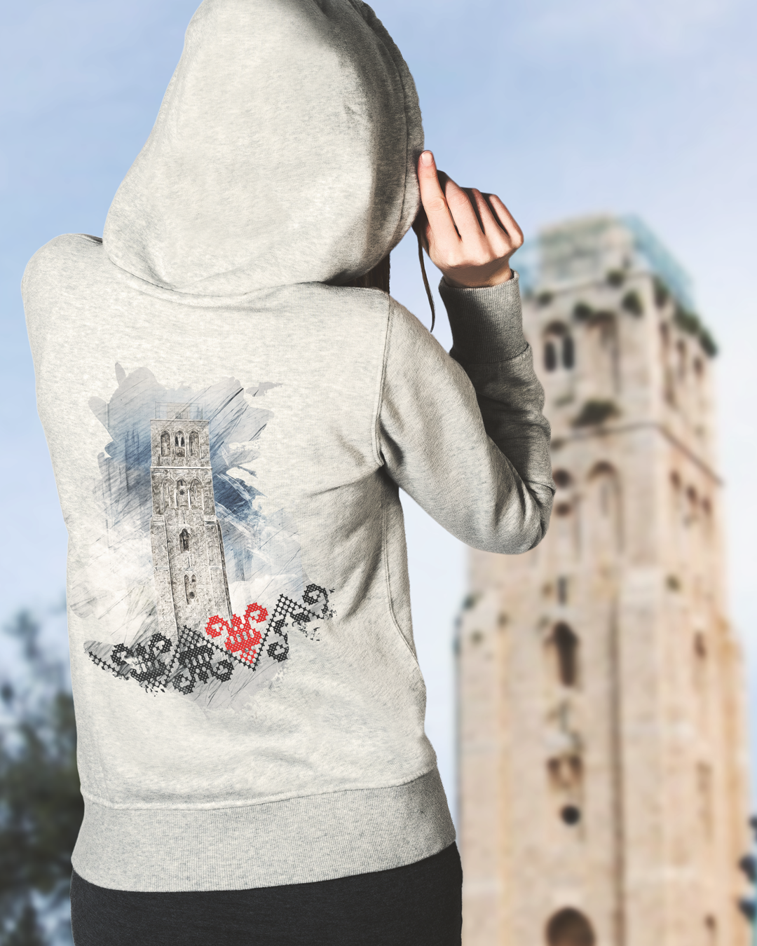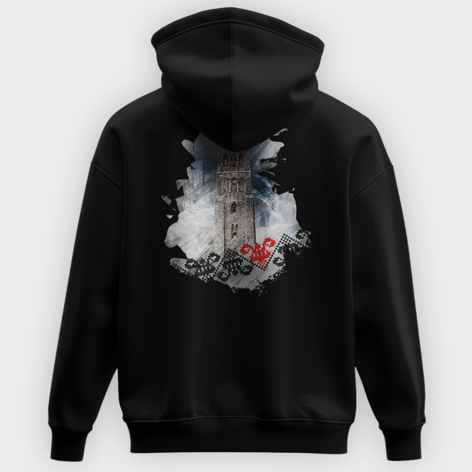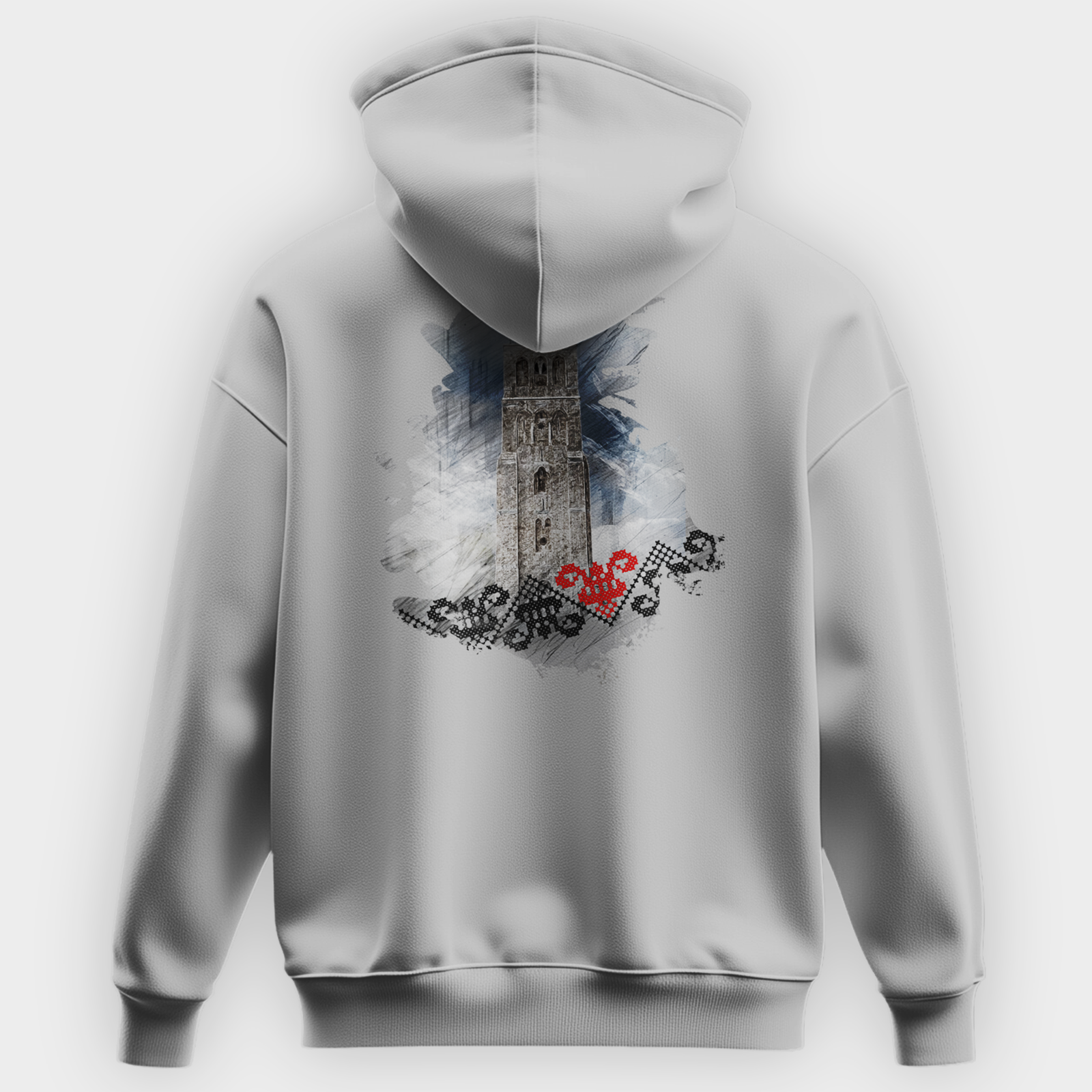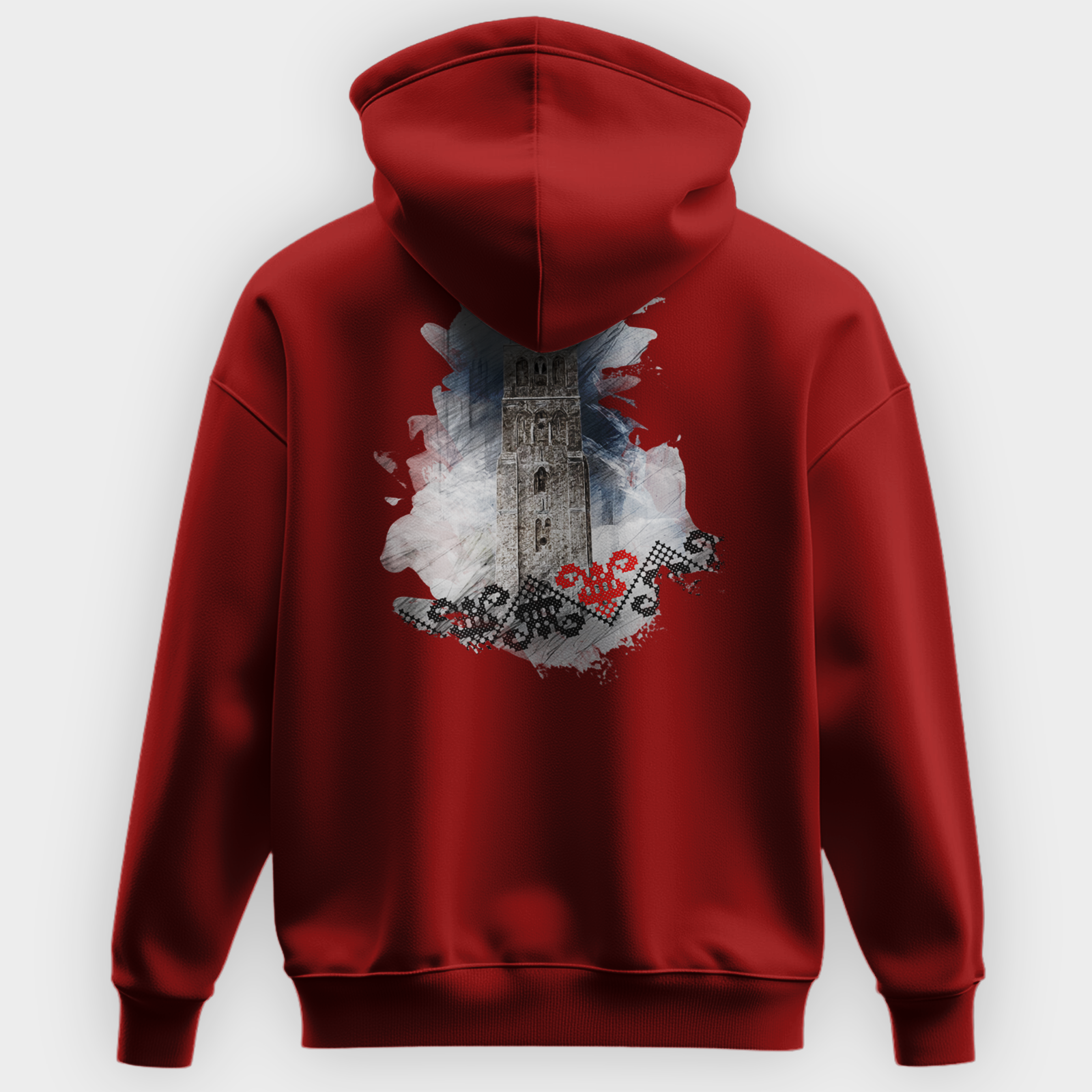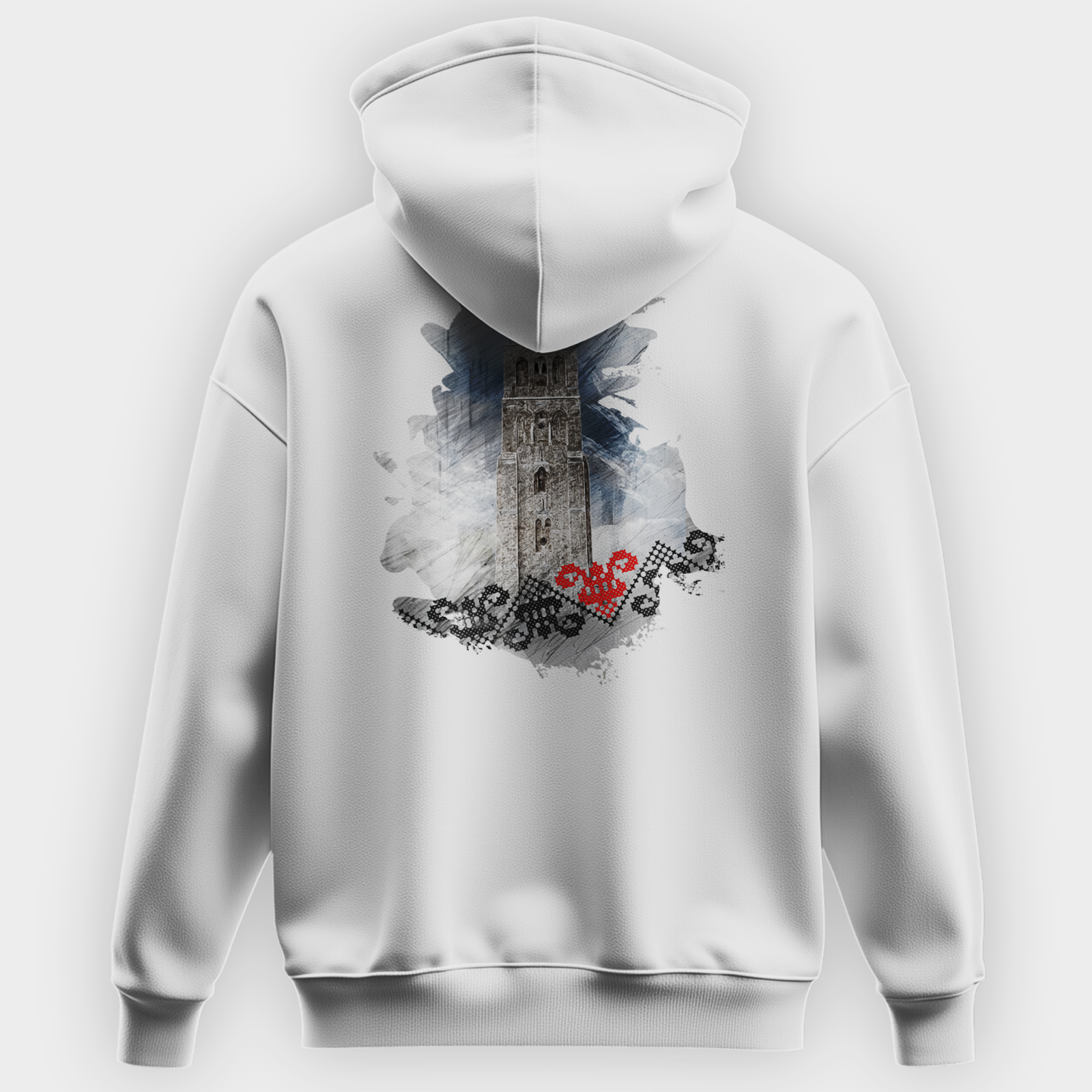 The White Mosque of Ramla hoodie features a stylish tribute to the historic White Mosque in Ramla, Palestine. The front of the hoodie showcases the word “RAMLA” in a traditional embroidered-style font, reflecting Palestinian heritage. The back design presents a striking artistic rendering of the mosque’s iconic minaret, surrounded by a watercolor-style background with Palestinian embroidery patterns and a red tatreez heart symbolizing cultural pride. Available in white, black, navy, maroon and grey, this hoodie blends history, art, and tradition into a wearable statement.