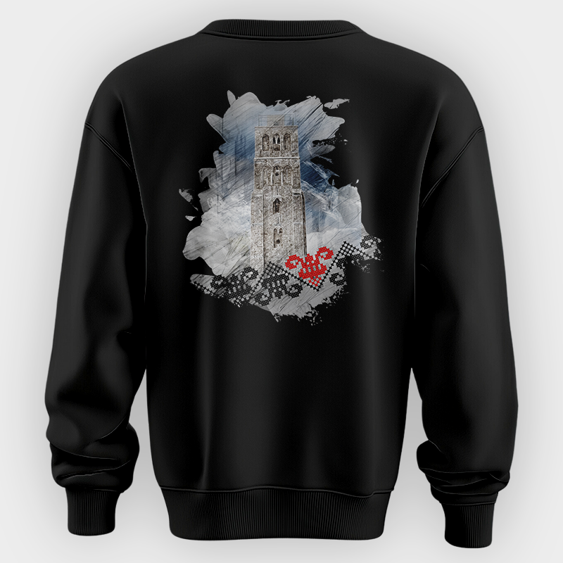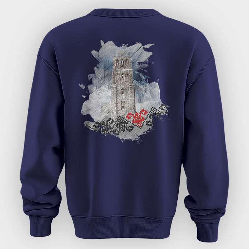 The White Mosque of Ramla Sweatshirt features a stylish tribute to the historic White Mosque in Ramla, Palestine. The front of the sweatshirt showcases the word “RAMLA” in a traditional embroidered-style font, reflecting Palestinian heritage. The back design presents a striking artistic rendering of the mosque’s iconic minaret, surrounded by a watercolor-style background with Palestinian embroidery patterns and a red tatreez heart symbolizing cultural pride. Available in white, black and navy, this sweatshirt blends history, art, and tradition into a wearable statement.